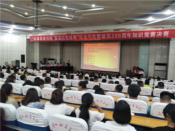6月25日晚,我院在图书馆报告厅举办“追慕革命导师 重温红色经典”纪念马克思诞辰200周年知识竞赛决赛。党委宣传部部长李志强、团委书记李玉群、社会科学部主任刘秀清观看比赛。本次活动由院团委、党委宣传部、社会科学部主办,院学生会、学生社团联会承办。